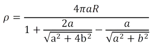 ρ=2πaR(1+2aπ(lna2+4b2a−2ba2+4b2))\rho = 2 \pi a R \left(1 + \frac{2a}{\pi} \left(\ln \frac{\sqrt{a^2 + 4b^2}}{a} - \frac{2b}{\sqrt{a^2 + 4b^2}}\right)\right)ρ=2πaR(1+π2a(lnaa2+4b2−a2+4b22b))